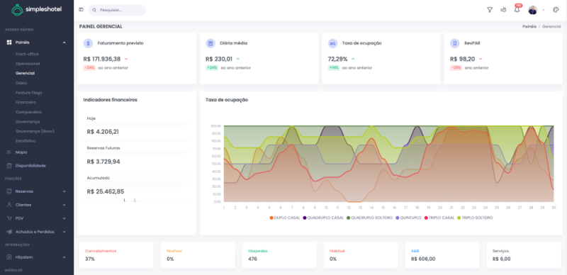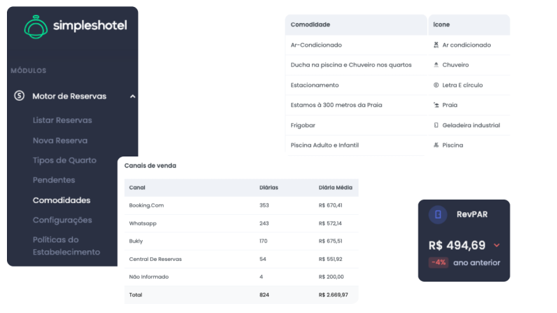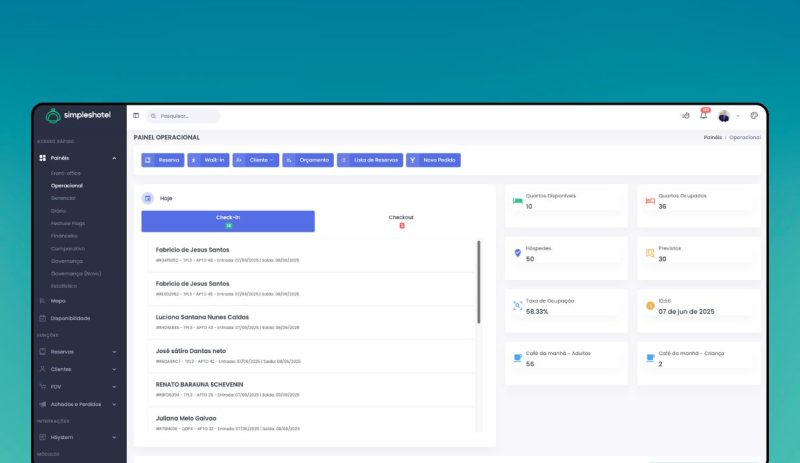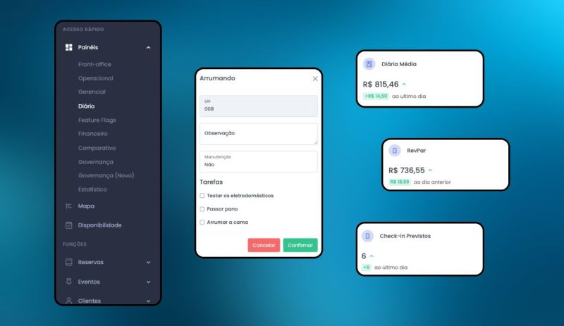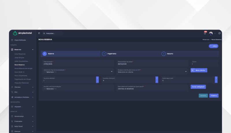 Chega de planilhas complexas e overbooking! Nosso sistema de gestão hoteleira (PMS) centraliza todas as operações, do mapa de reservas ao checkout, liberando seu tempo para focar no hóspede.